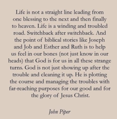 Kehidupan bukanlah satu garis lurus yang mengarah dari satu berkat ke berkat berikutnya dan akhirnya ke surga. Kehidupan adalah jalan yang berkelak-kelok dan penuh kesukaran. Putar balik, lalu putar balik lagi. Dan inti cerita-cerita alkitabiah seperti kisah Yusuf, Ayub, Ester, dan Rut, menolong kita untuk yakin (bukan hanya tahu) bahwa Tuhan menolong kita di setiap perubahan yang sukar itu. Allah bukan hanya hadir setelah masa kesukaran kita berakhir dan telah diselesaikan-Nya. Ia juga merencanakan arah hidup kita dan mengelola masalah-masalah itu dengan tujuan-tujuan yang sangat besar dampaknya bagi kebaikan kita dan bagi kemuliaan Yesus Kristus.