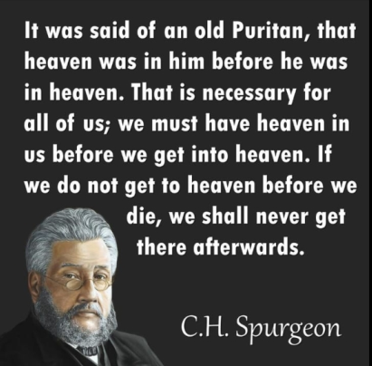 Seorang Puritan kuno mengatakan bahwa surga sudah ada di dalam dirinya sebelum ia berada di dalam surga. Pemahaman itu penting bagi kita semua; kita harus memiliki surga di dalam diri kita sebelum kita masuk ke surga. Jika kita tidak memiliki surga sebelum kita meninggal, kita tidak akan pernah sampai ke surga setelah kita meninggal. (C.H. Spurgeon)